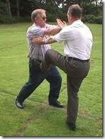 Photos d34-d43 show an emergency situation that goes against the WC principles by going a Choy La Fut type of move and striking with a knife hand while the body is lowered. The kick here can be varied as can the range of these moves. I have gone wide so I can kick the lead foot, if I was tighter in I may well kick the rear leg don’t be afraid to change it around a bit your attacker wont always oblige by puts his leg forward for you to kick